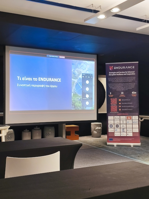 Στις 19 Μαρτίου, στην Αθήνα, πραγματοποιήθηκε με επιτυχία η 2η Ελληνική Εθνική Ημερίδα ENDURANCE, η οποία διοργανώθηκε από την εταιρεία Synelixis (SYN), ως επικεφαλής εταίρος του έργου στην Ελλάδα, με θέμα: «Ενίσχυση της Ανθεκτικότητας Κρίσιμων Υποδομών μέσω του Ελληνικού Πιλότου του έργου ENDURANCE». Συμμετέχοντες ήταν το Περιφερειακό Ταμείο Ανάπτυξης Αττικής, το Περιφερειακό Ταμείο Ανάπτυξης Δυτικής Ελλάδας και η ΕΥΔΑΠ Α.Ε.