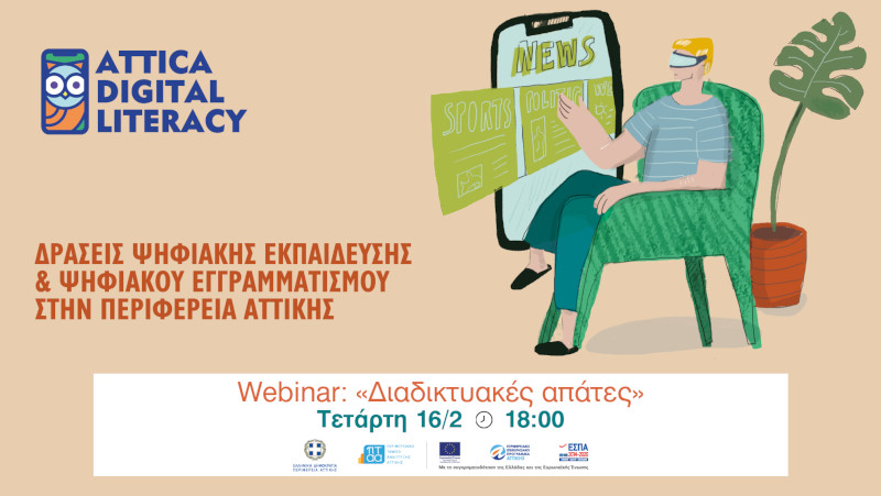 Σας περιμένουμε διαδικτυακά την Τετάρτη 16 Φεβρουαρίου 2022 στις 18:00 στο 4ο Webinar του 2ου κύκλου με θέμα «Διαδικτυακές απάτες Προστασία Ψηφιακών Συσκευών» στο κανάλι YouTube και στη σελίδα Facebook του Ψηφιακού Εγγραμματισμού.