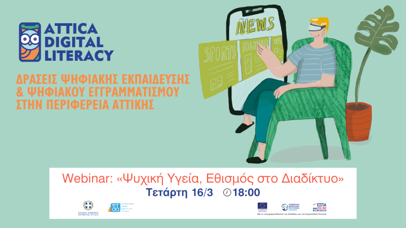 Σας περιμένουμε διαδικτυακά την Τετάρτη 16 Μαρτίου 2022 στις 18:00 σε ένα ακόμη webinar της δράσης, με θέμα «Ψυχική Υγεία, Εθισμός στο Διαδίκτυο» στο κανάλι YouTube και στη σελίδα Facebook του Ψηφιακού Εγγραμματισμού.